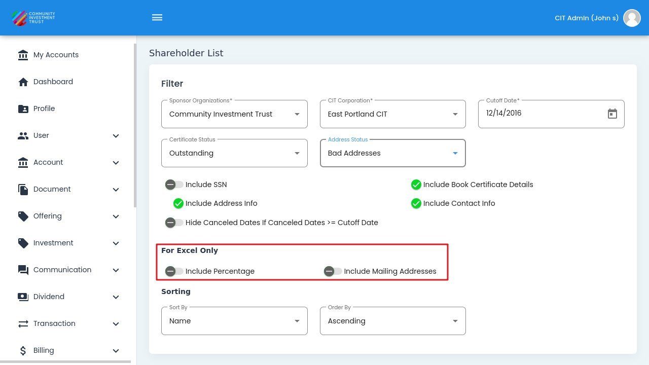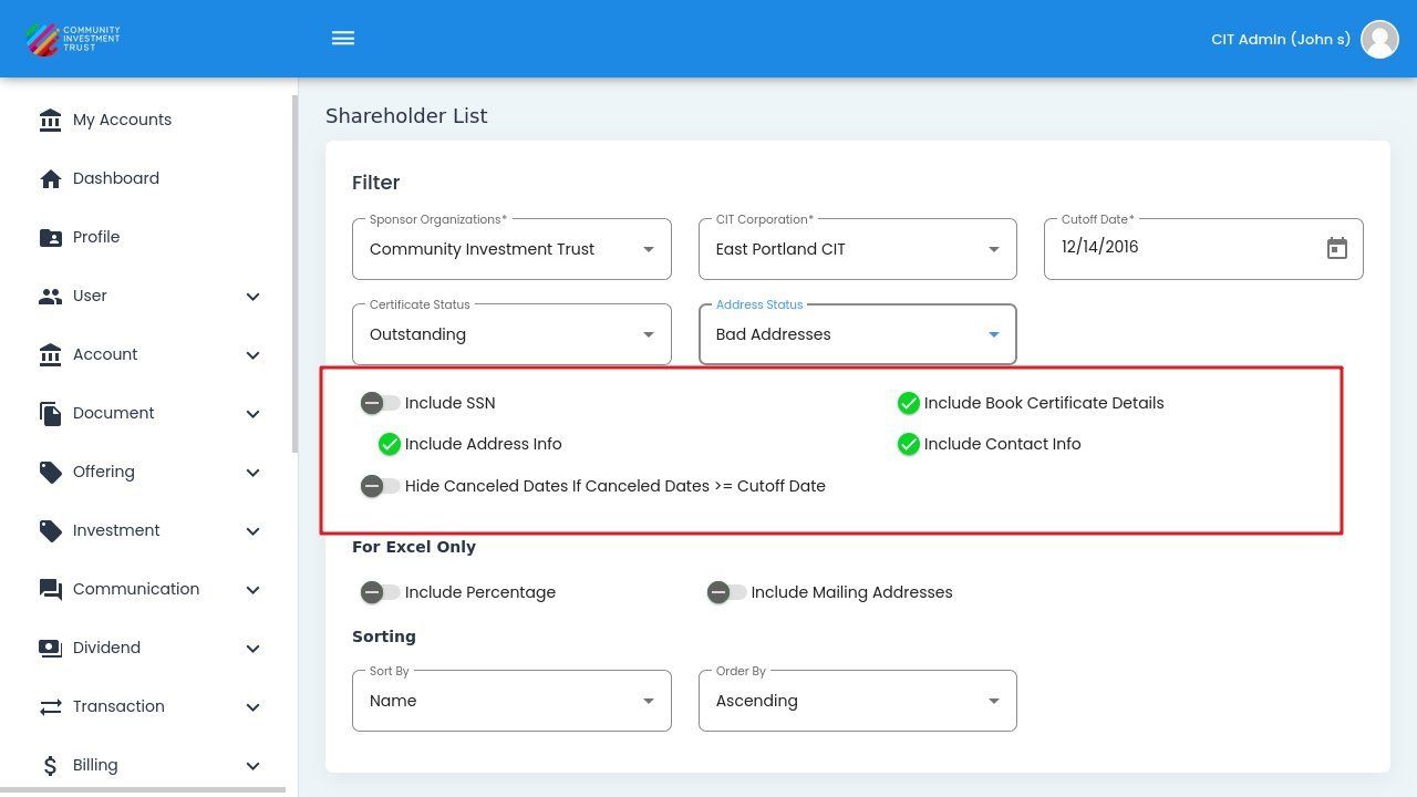 Configure the data fields included in your Shareholder List Report by toggling display options on or off.
