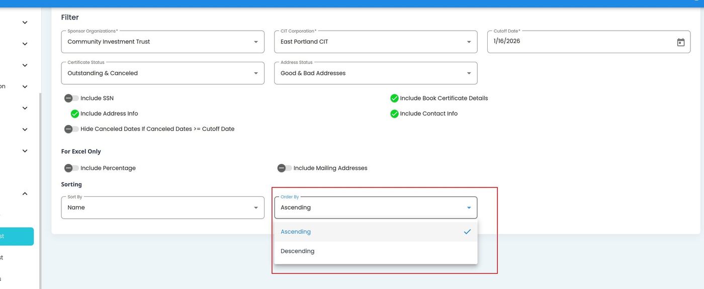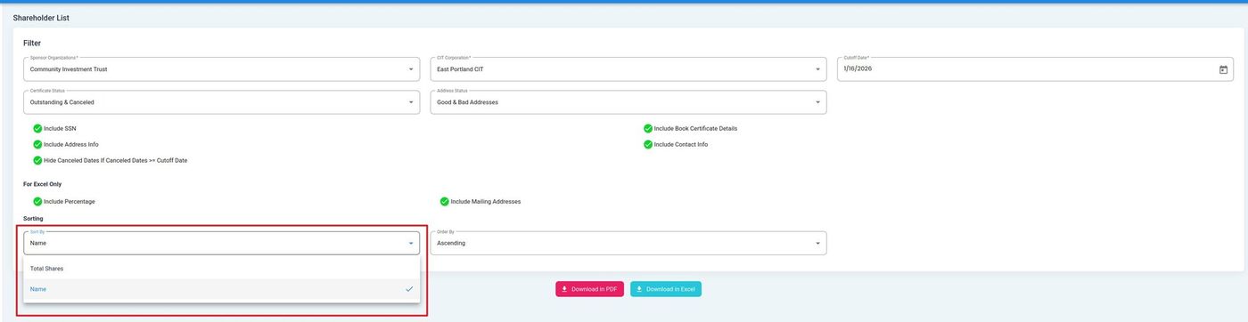 Configure how shareholder data is ordered in your report by selecting sort field and direction.