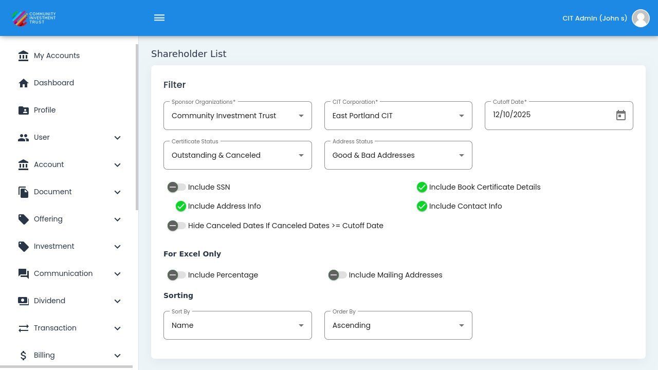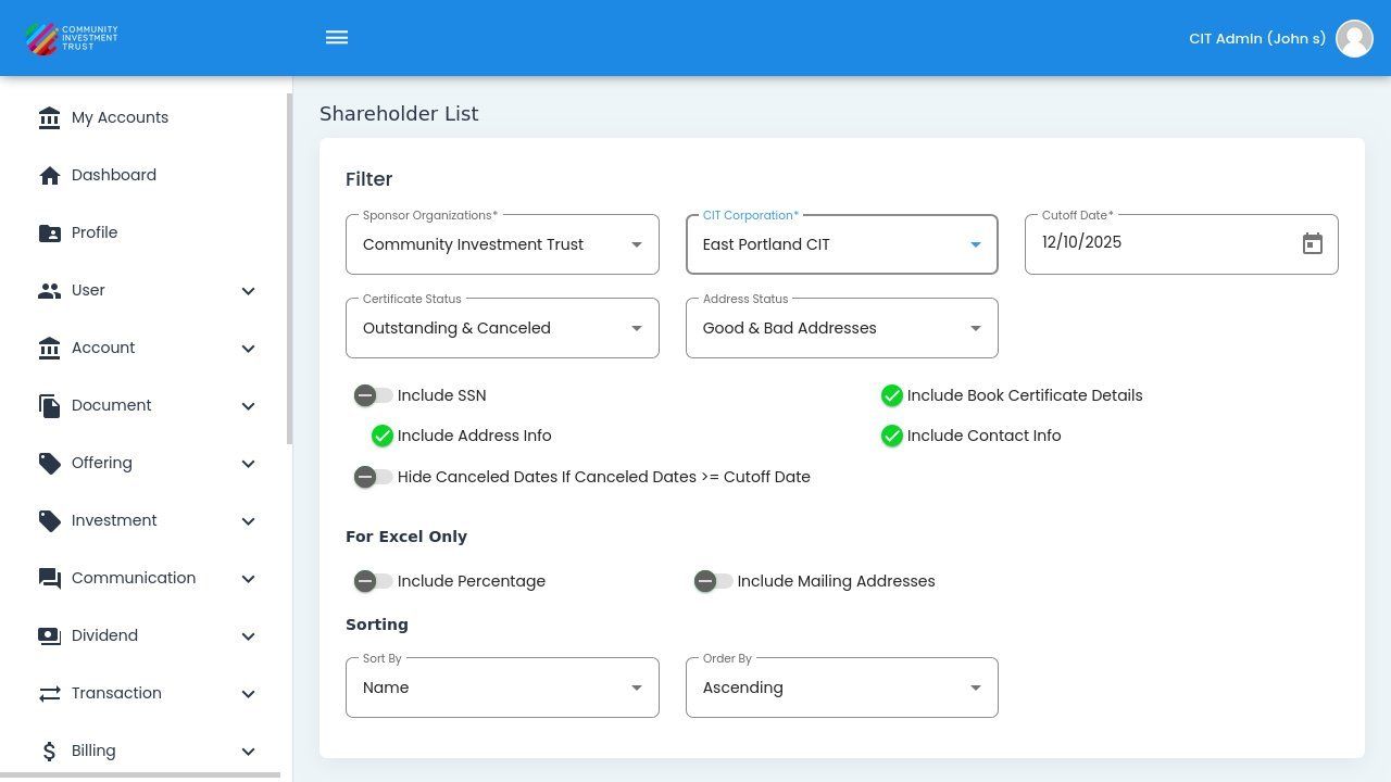 The Shareholder List Report generates downloadable PDF and Excel reports of all investors and their holdings. Administrators can filter by certificate status, address status, and customize the displayed data using toggle options.