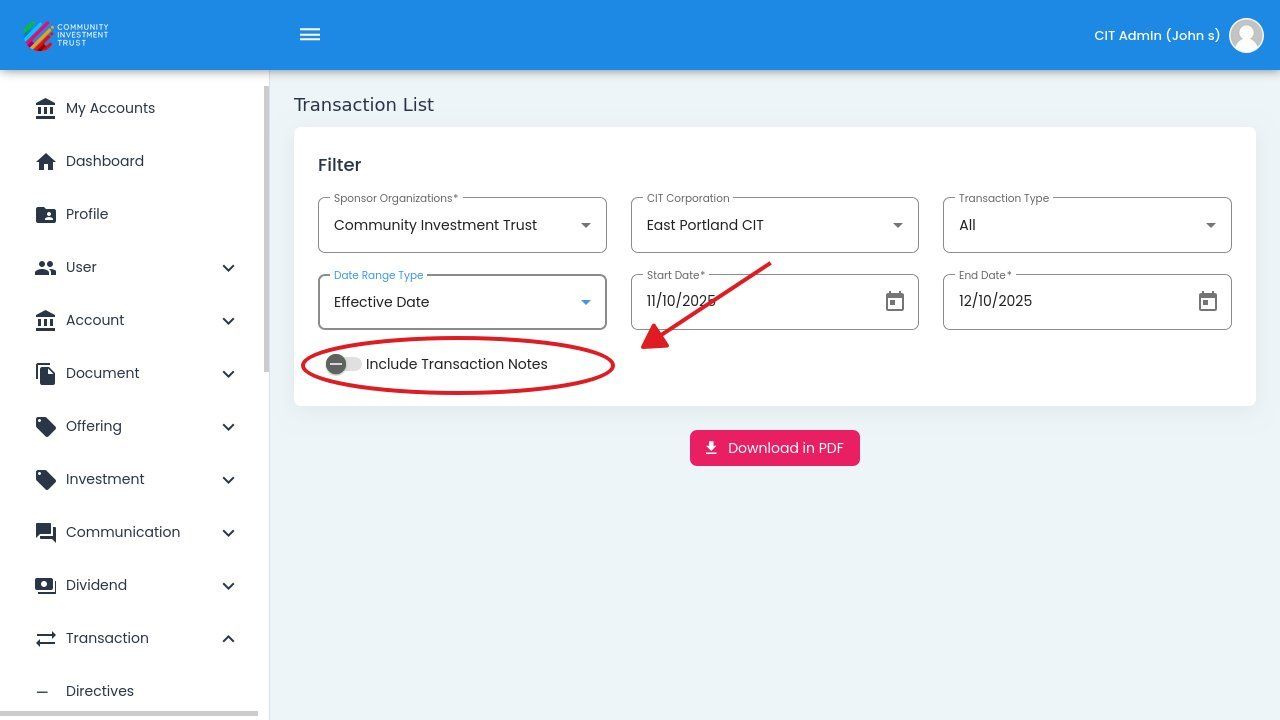 When enabled, any notes associated with transactions will be included in the PDF report. This is useful for tracking transaction-specific comments or processing details.