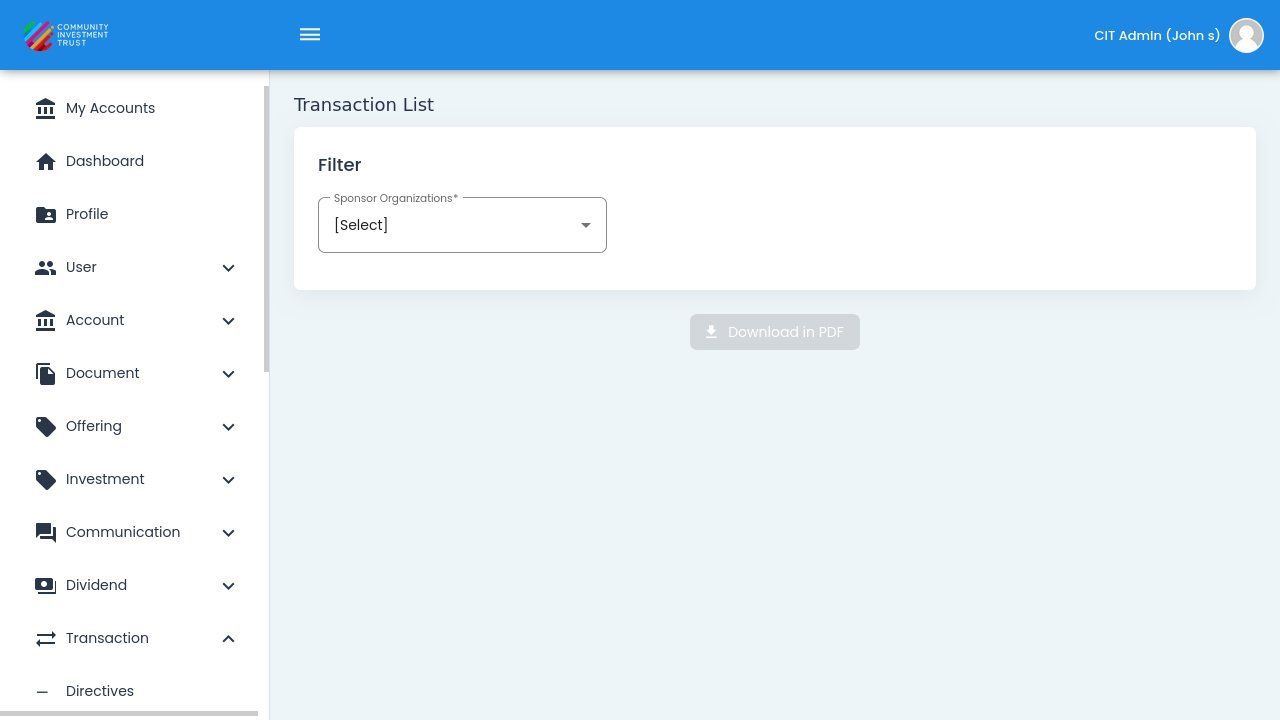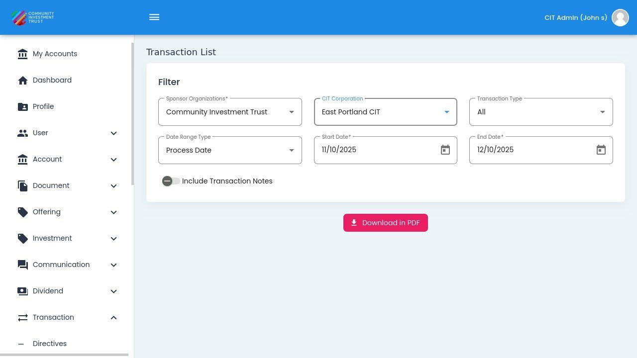 The Transaction List Report displays all investment transactions including new issuances, retirements (cashouts), and transfers. Filter by transaction type, date range, and sponsor organization to analyze specific transaction sets.