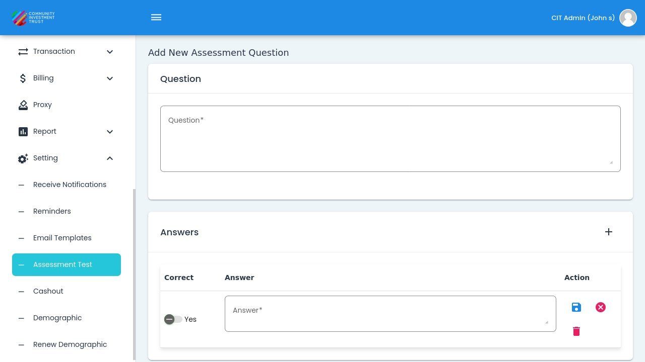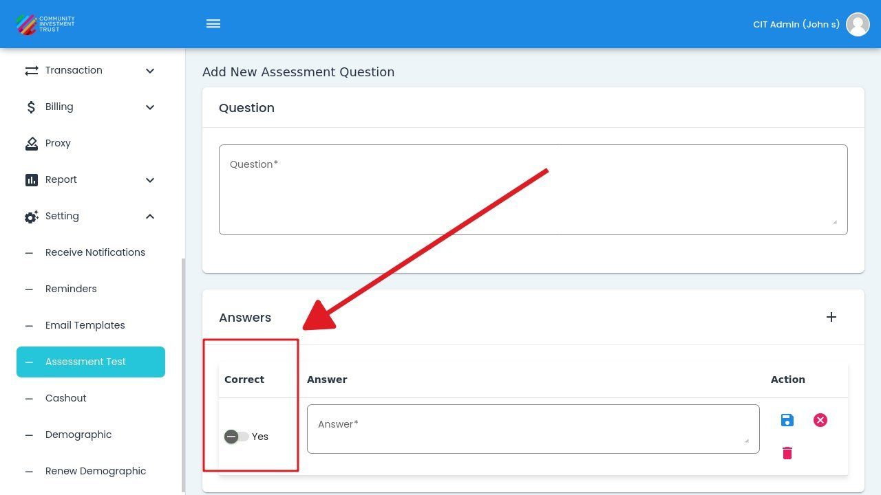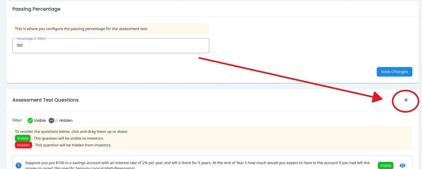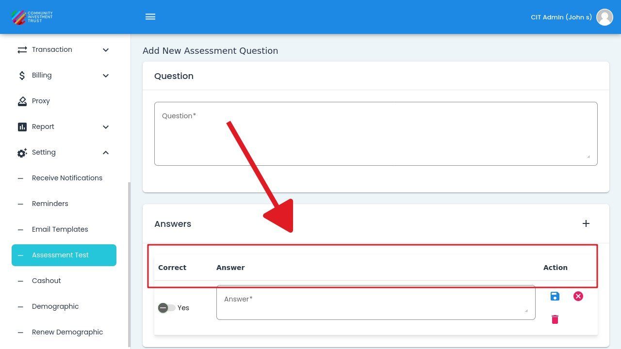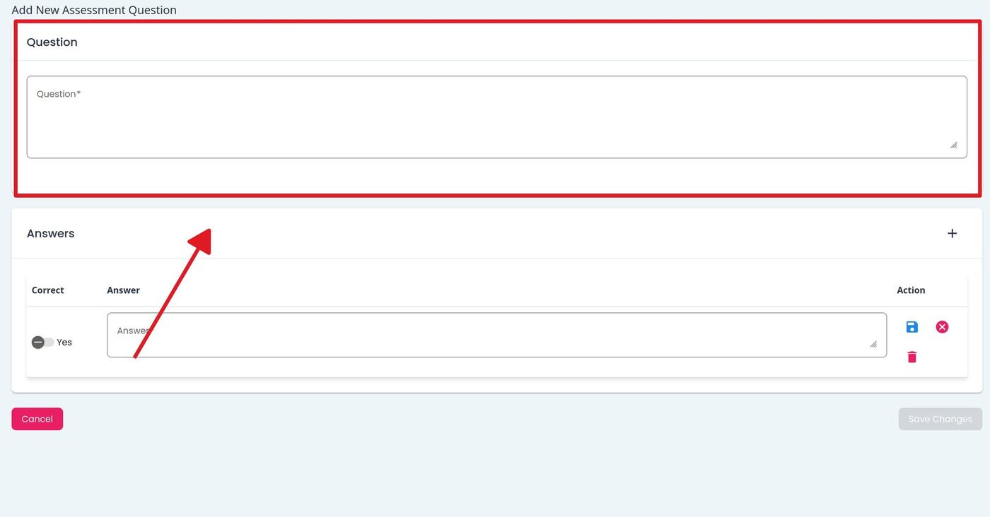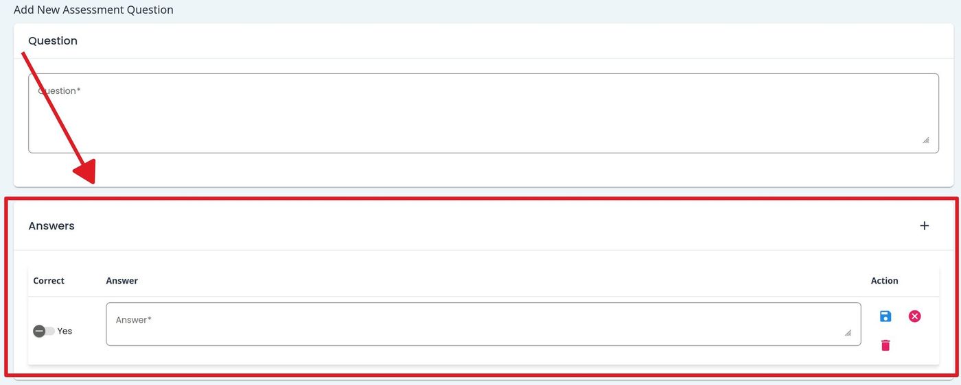 To add a new assessment question, Action: click the button.