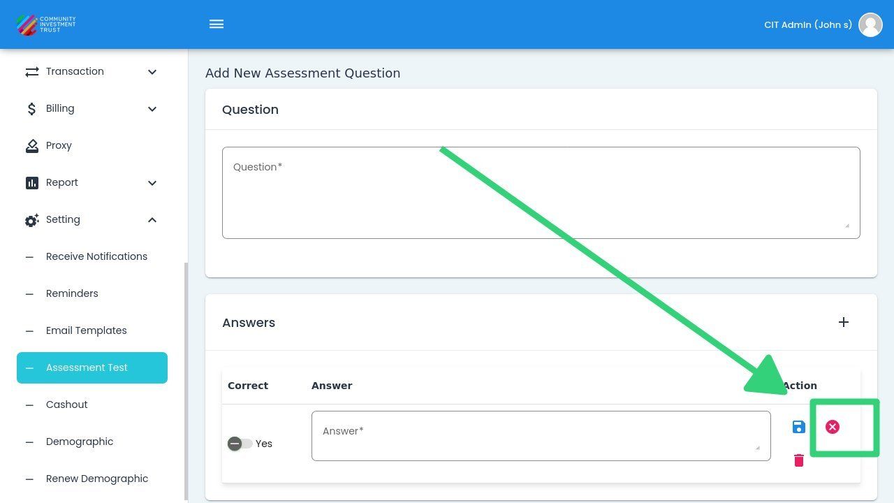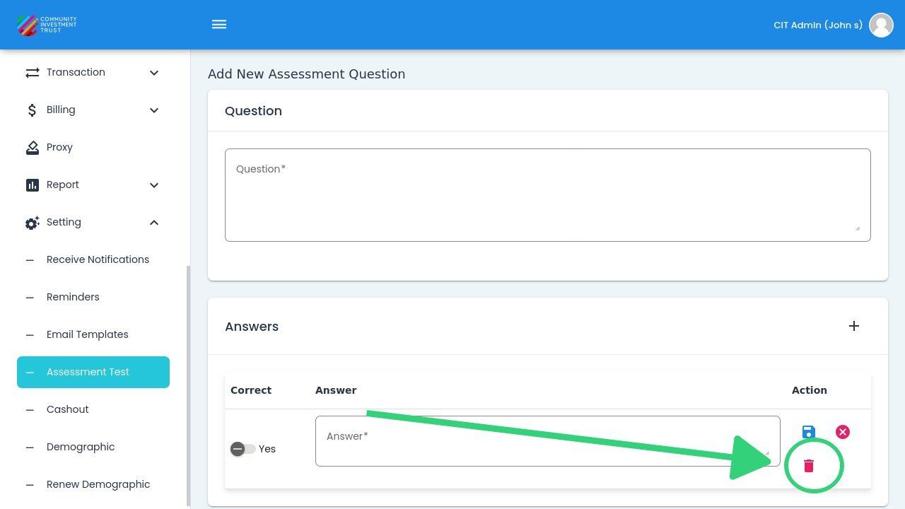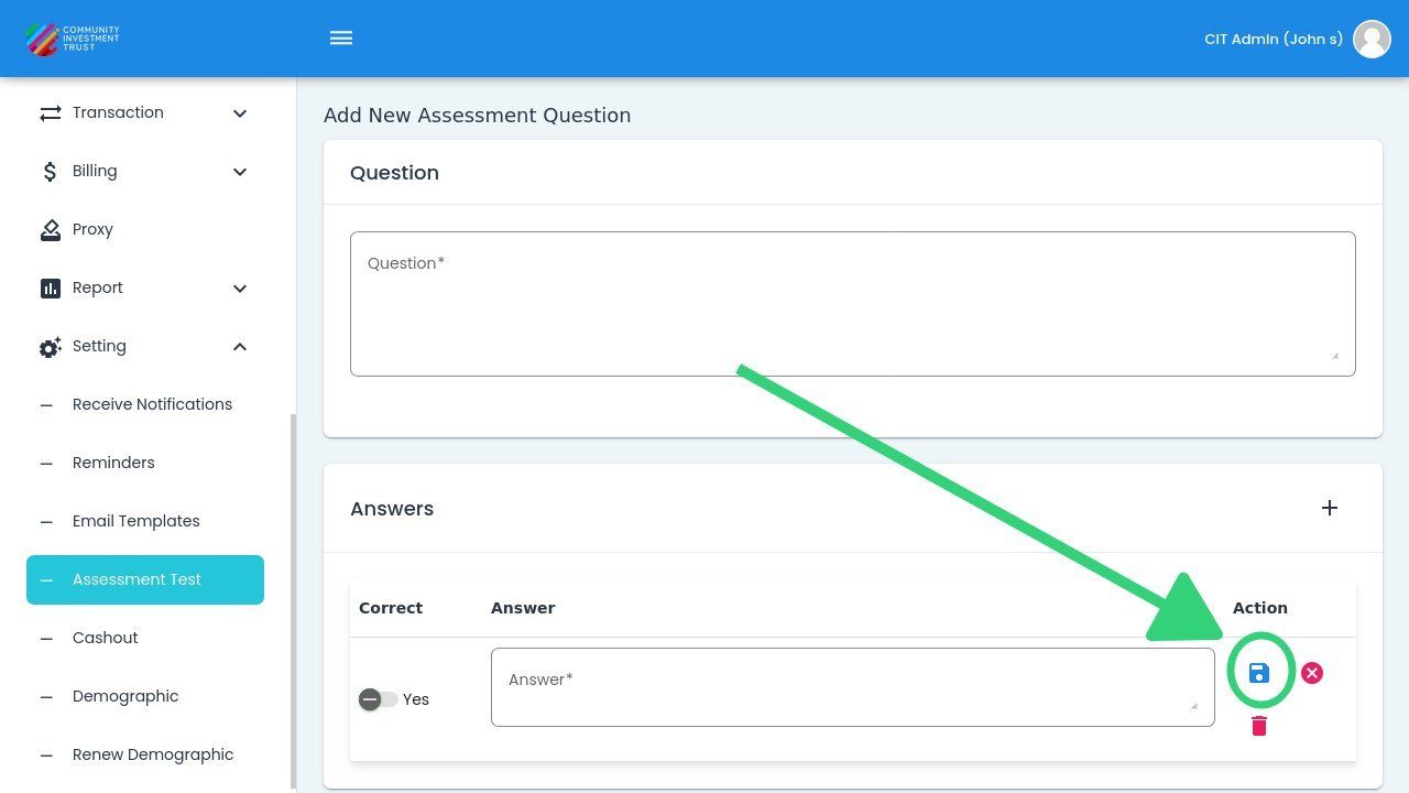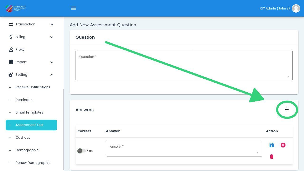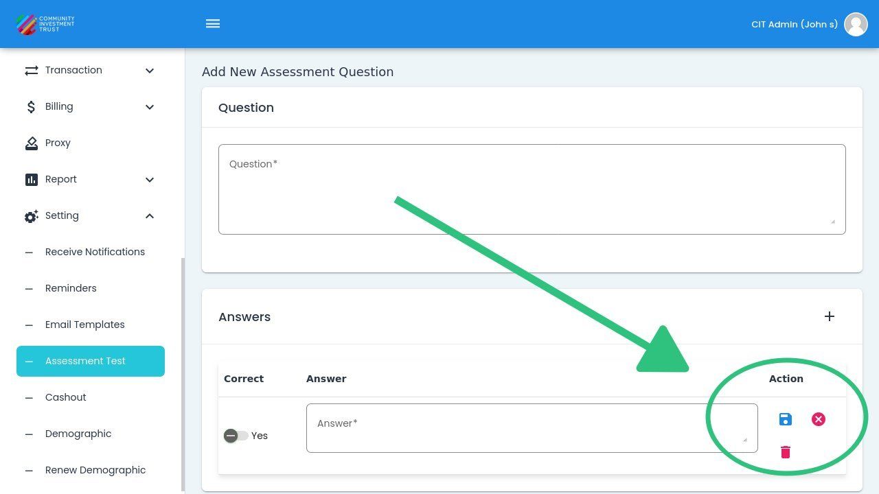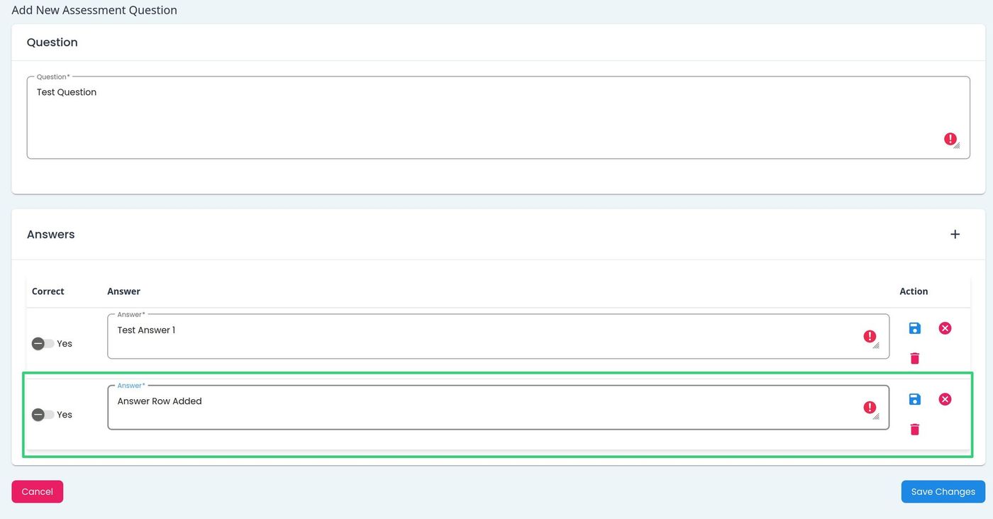 After adding an answer row, enter the answer text and select whether it is the correct answer.