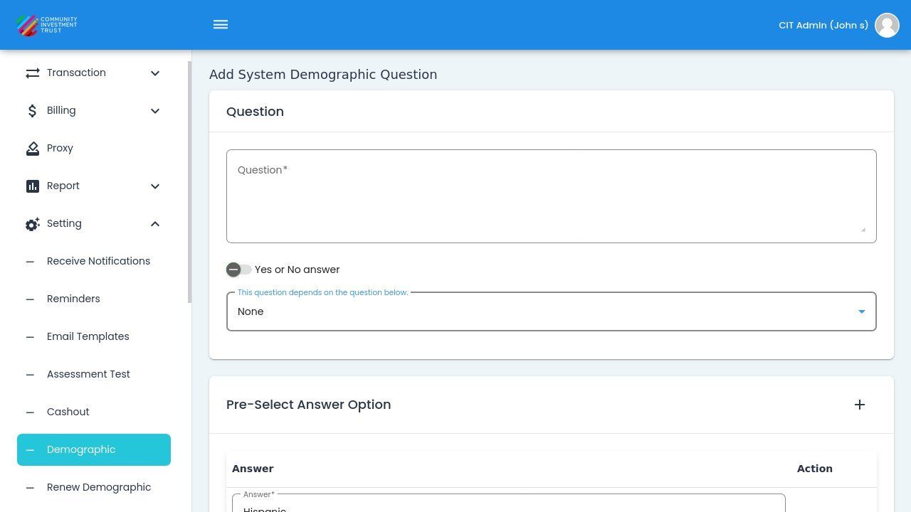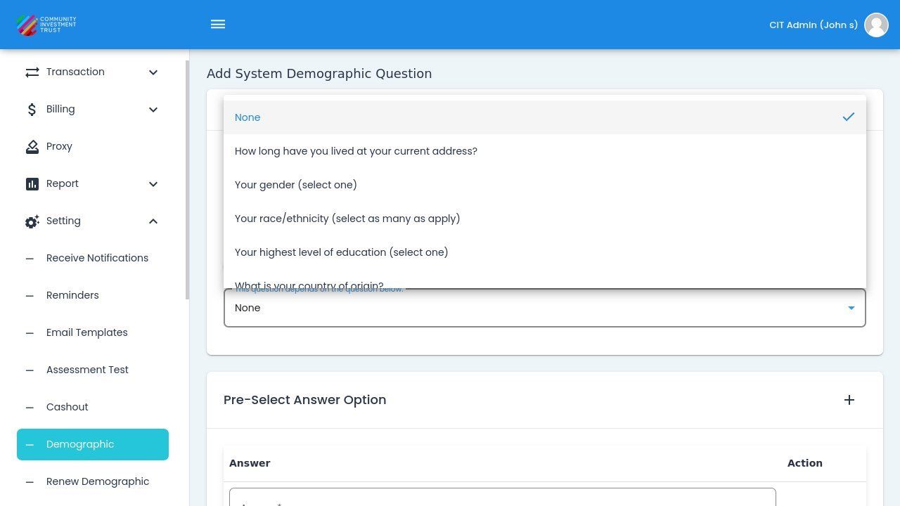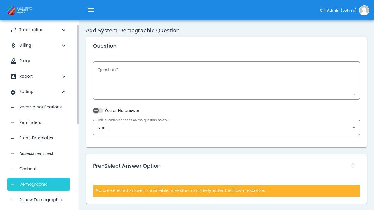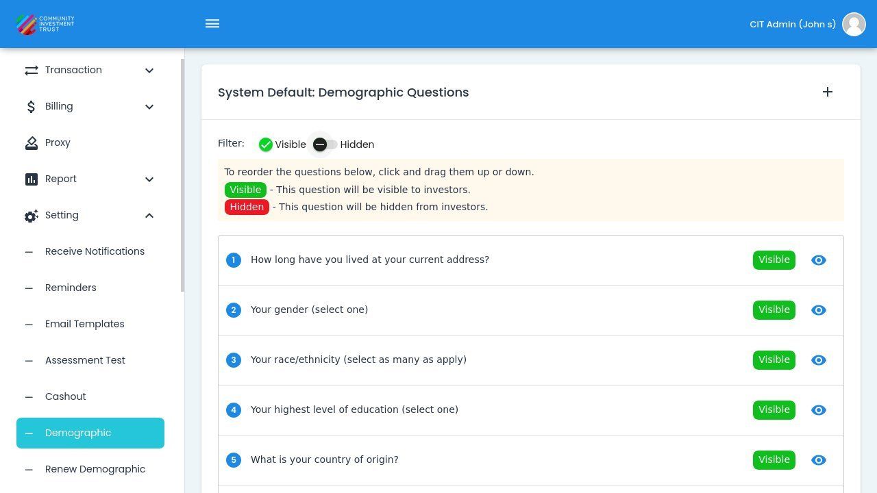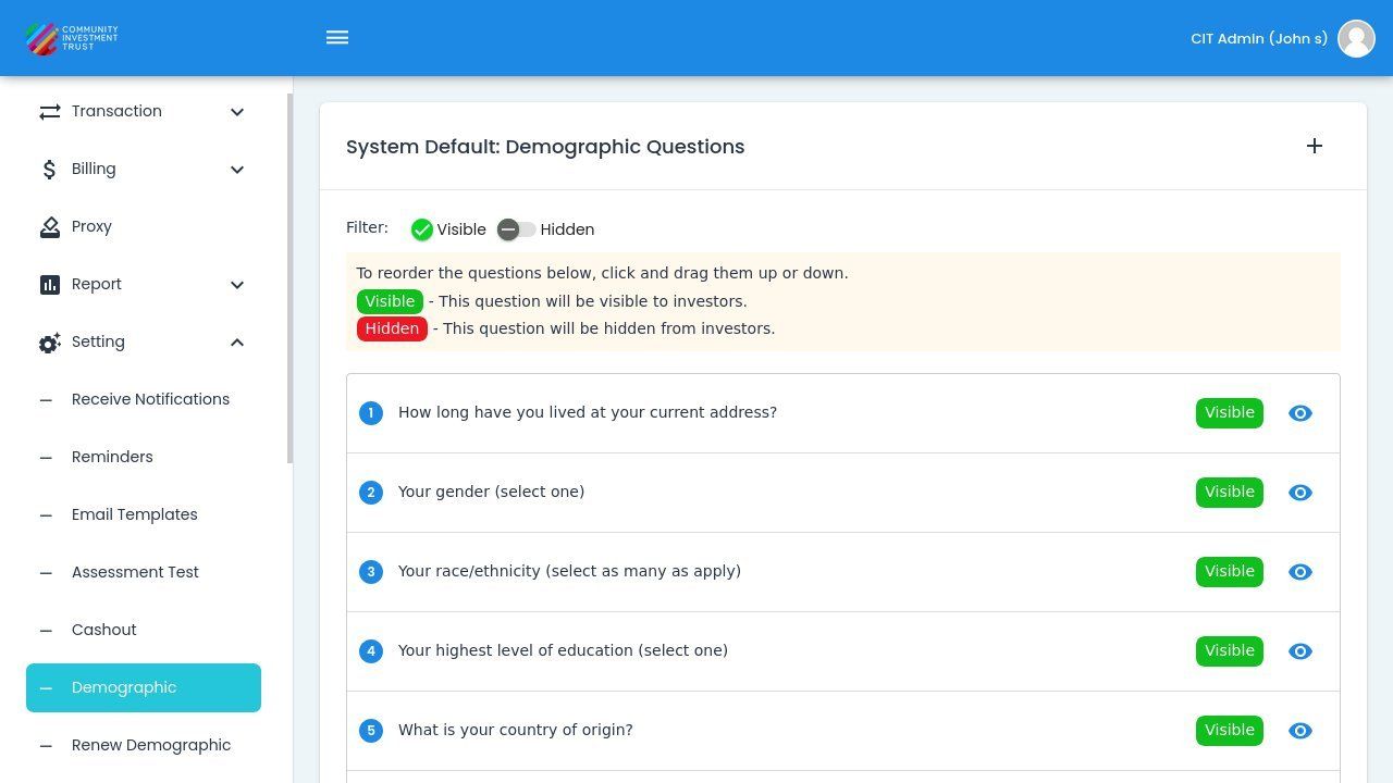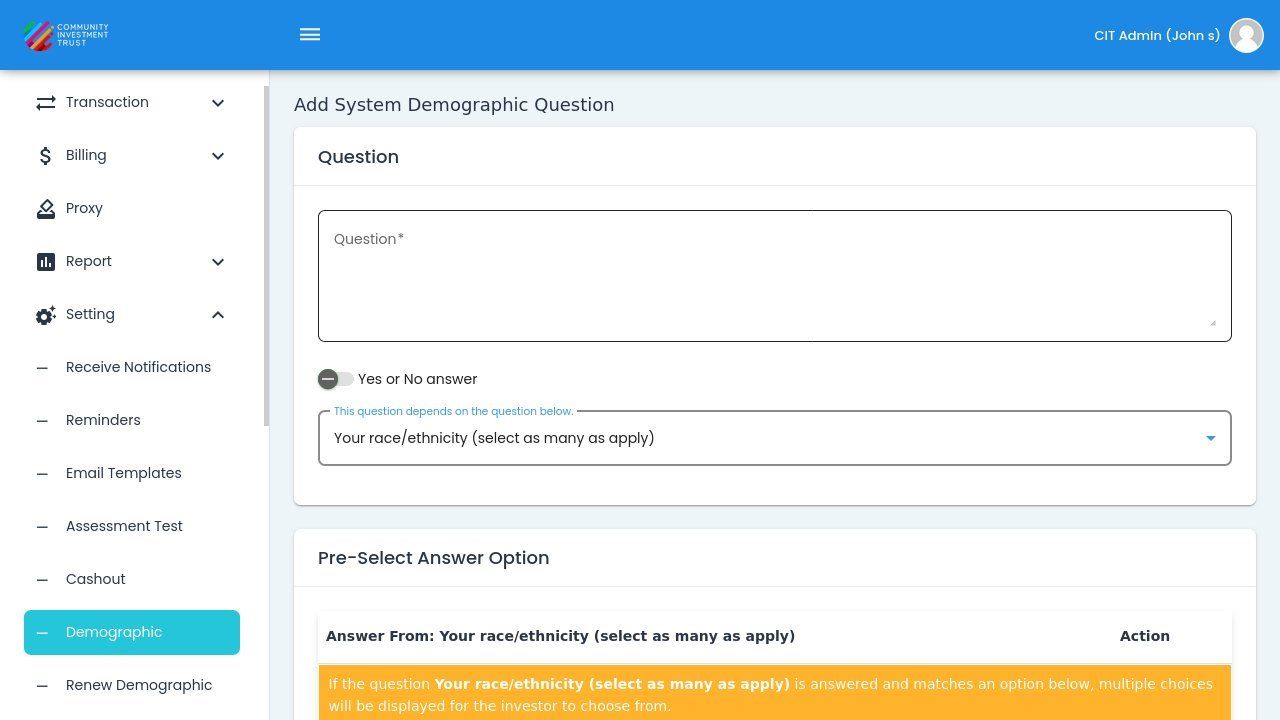 The Section: Demographic Questions settings allow administrators to configure the demographic data collection questions presented to investors.