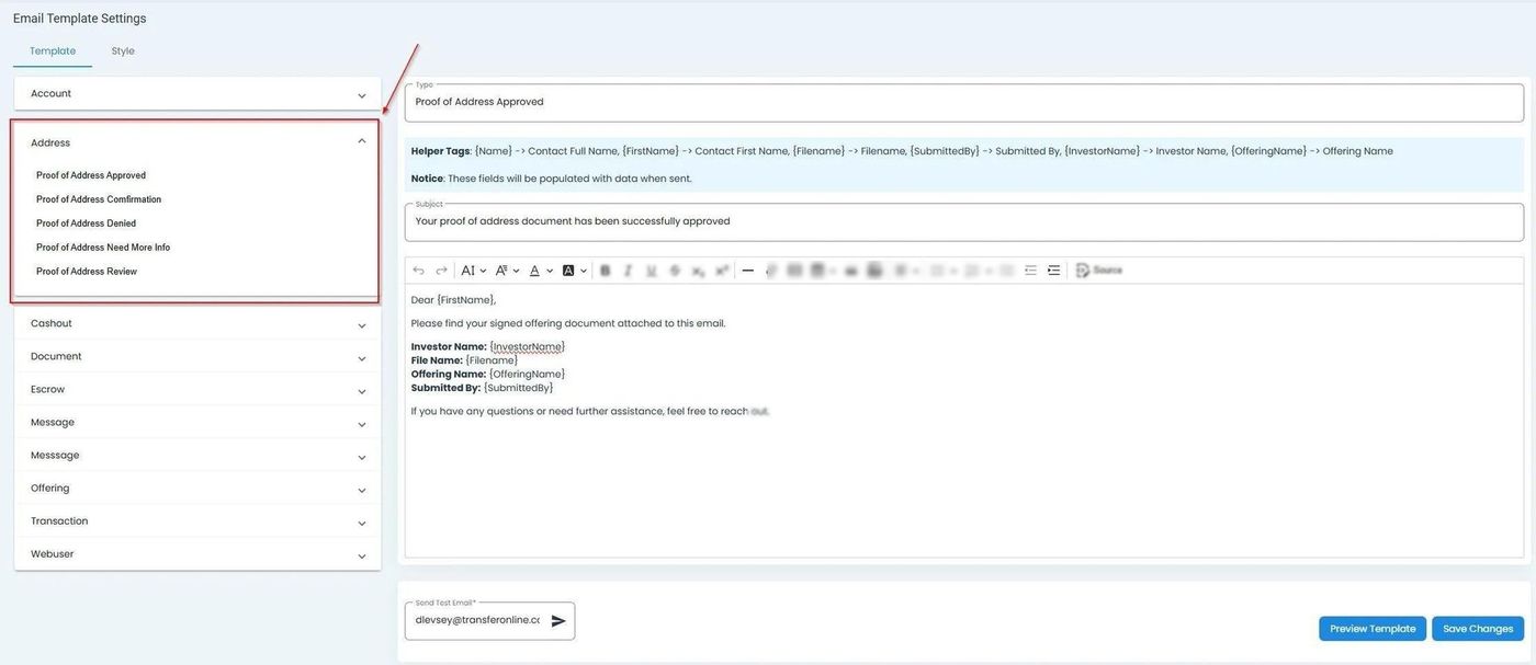 Use the template navigation to switch between different email template categories and customize each as needed.