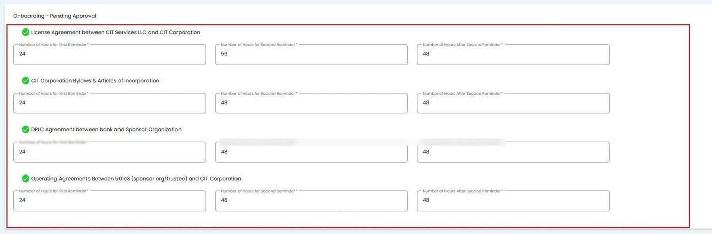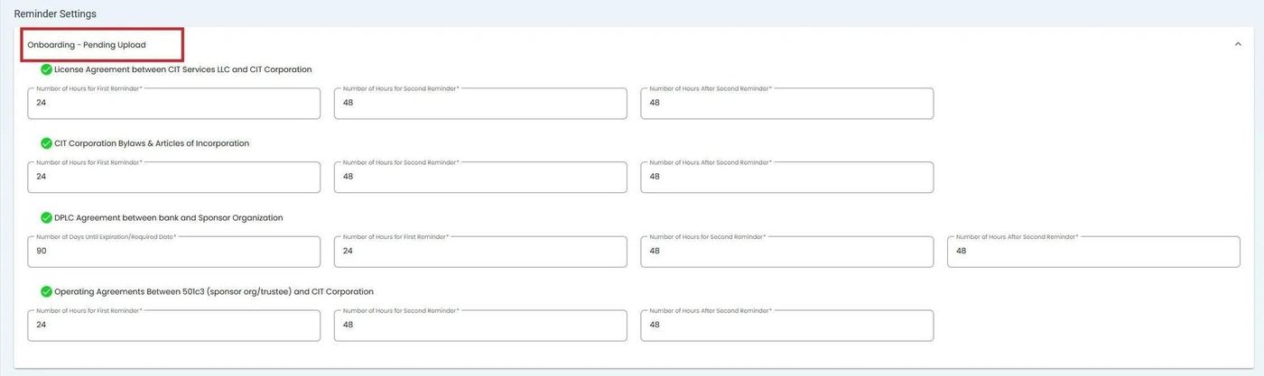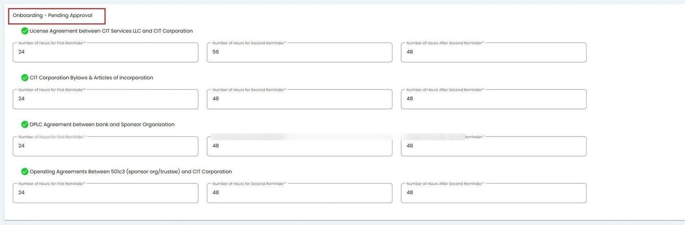 This section allows you to configure reminders for documents and information that have been submitted and are awaiting approval during the onboarding process.