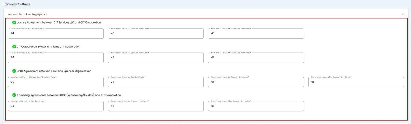 This section allows you to configure reminders for documents and information that need to be uploaded during the onboarding process.
