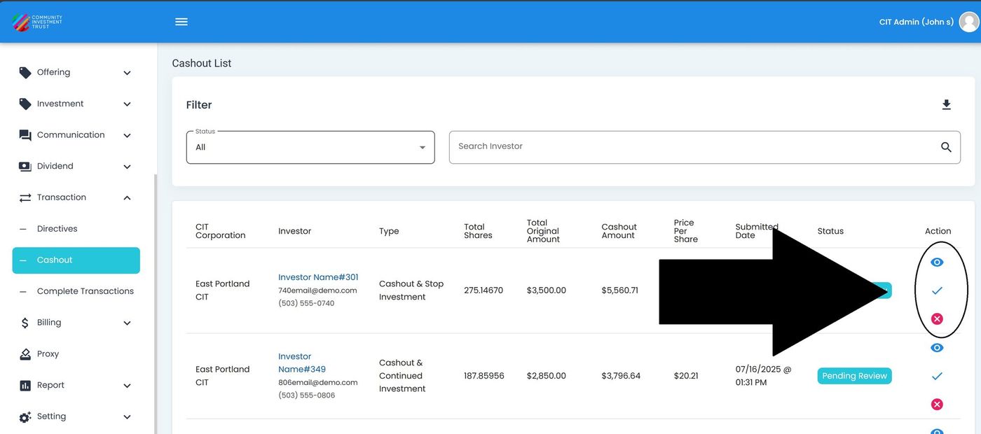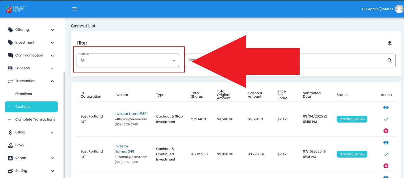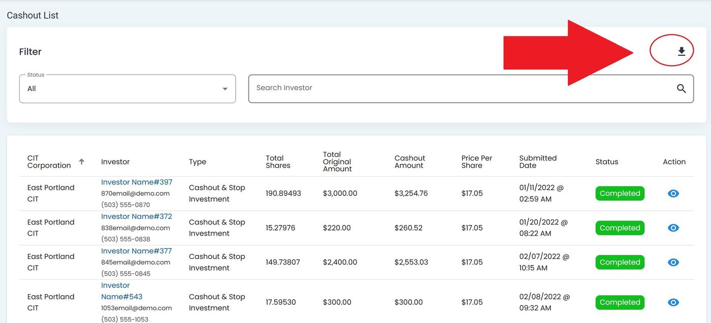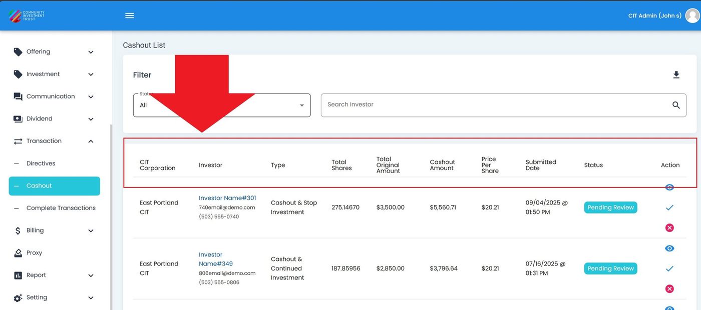 Column: Investor - The investor requesting the cashout (clickable link to investor profile).
