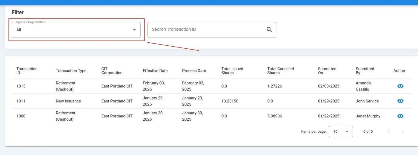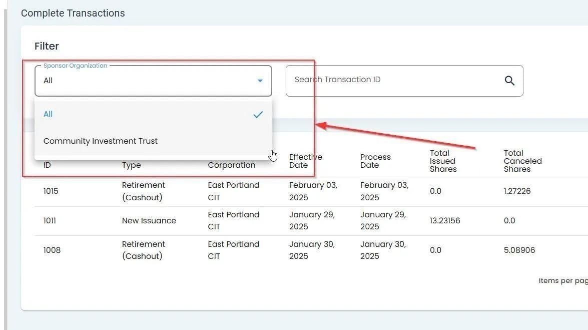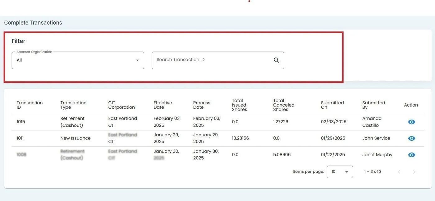 The filter section appears at the top of the Table: Complete Transactions List table.