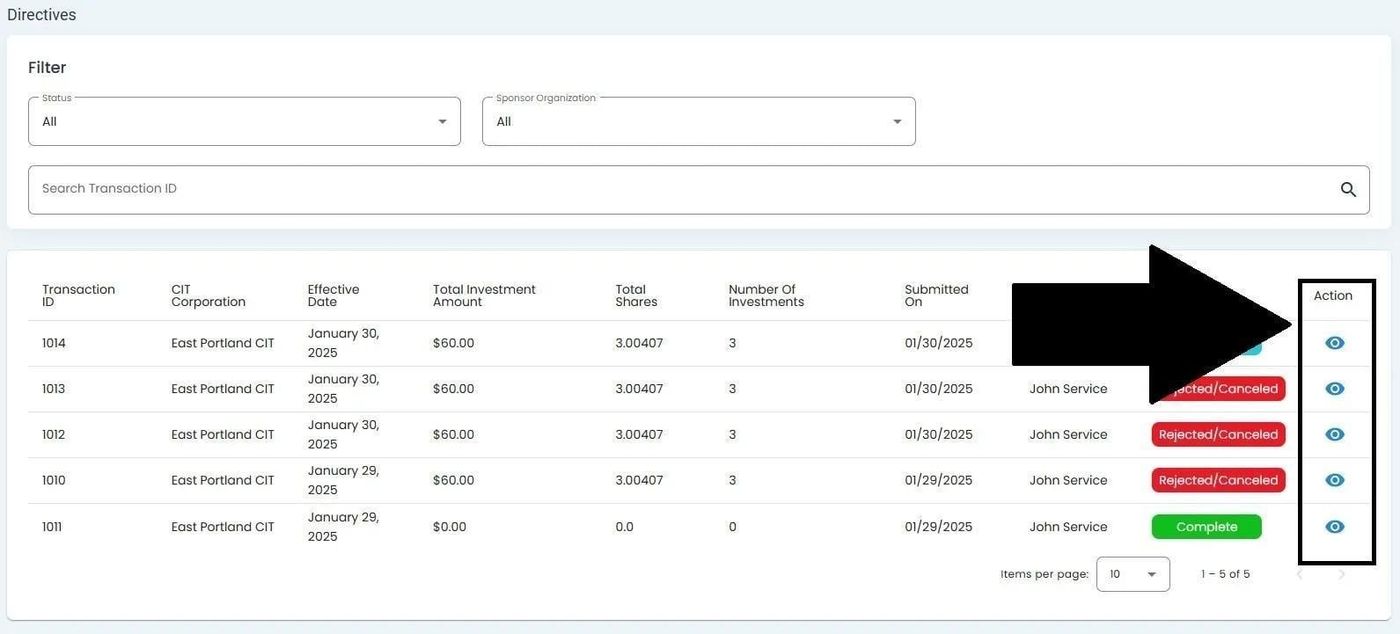 Use the search bar to find specific directives by Transaction ID.