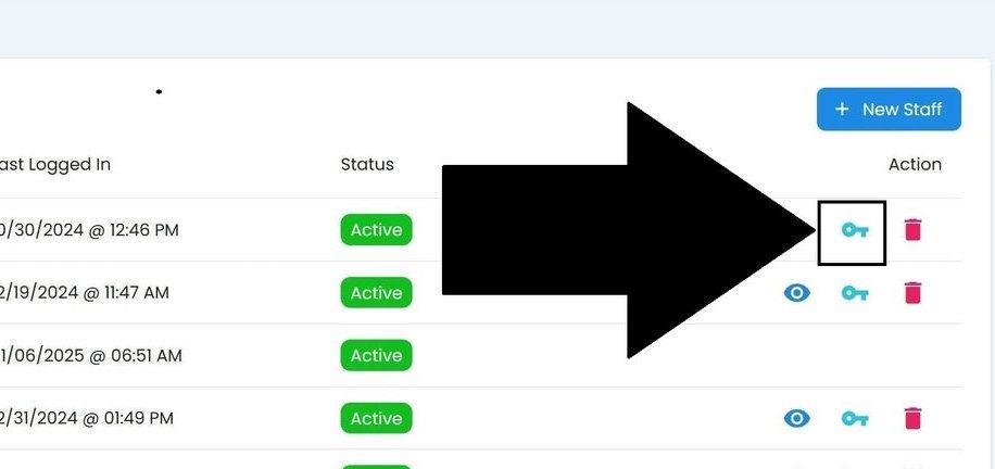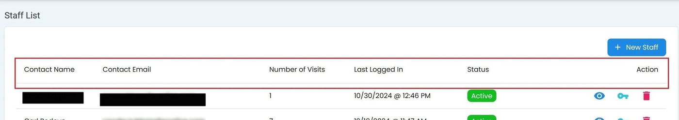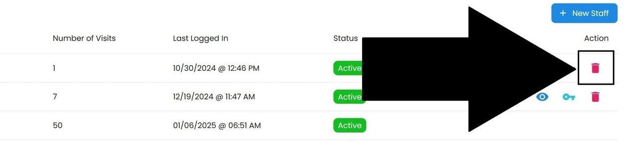 Each action in the Column: Action column provides access to different staff management functions. Below are the locations of each action button within the table.