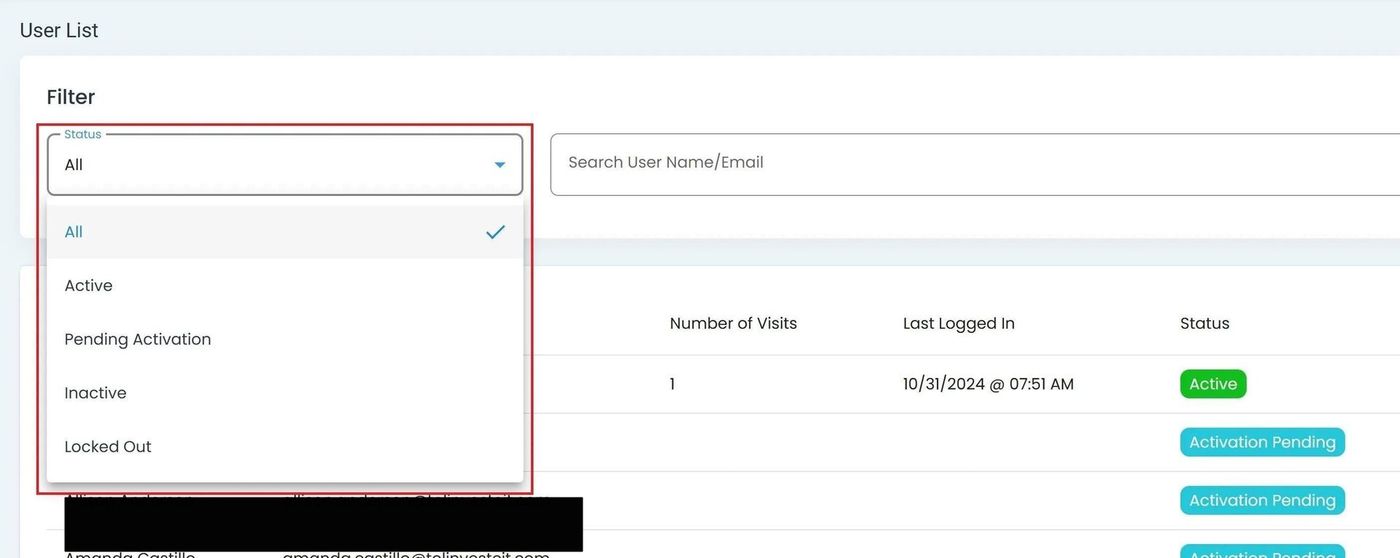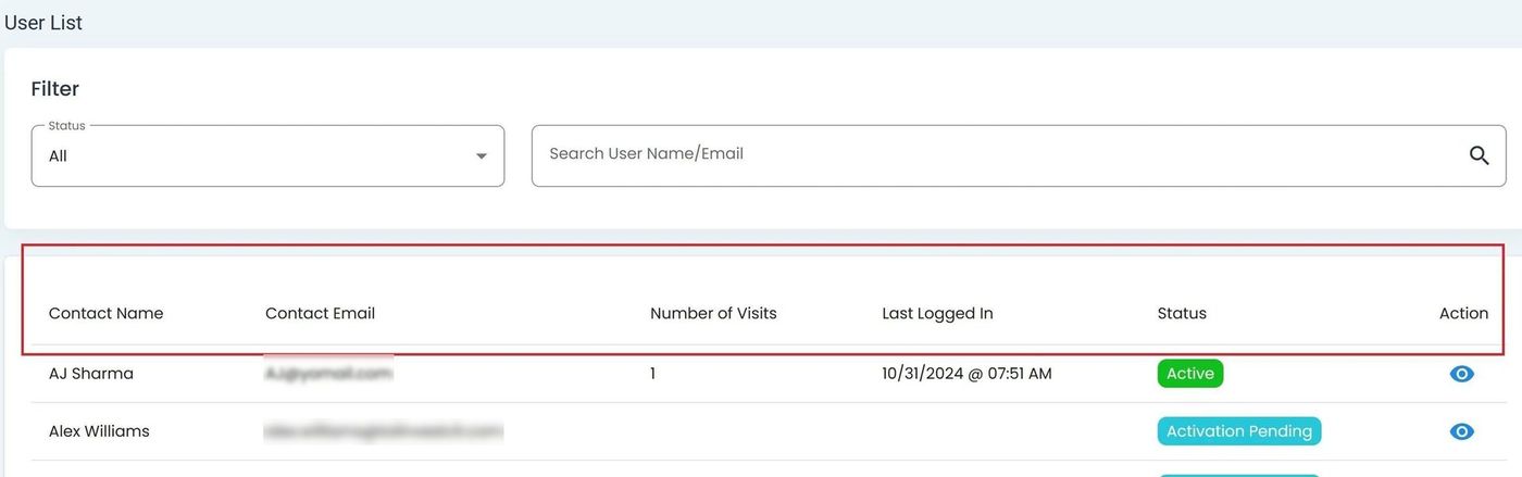 The Table: User List table summarizes key details for each Item: User in the current Item: CIT Corporation. It contains six Column: Columns with Column: Status and Column: Action at the end: