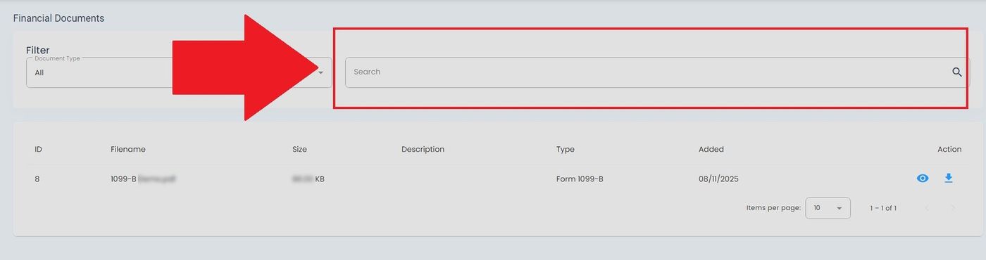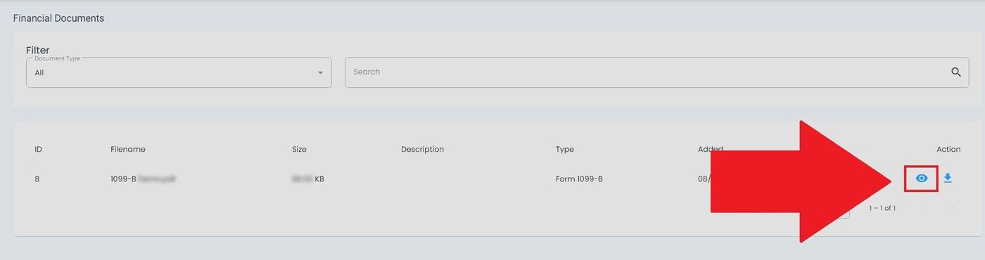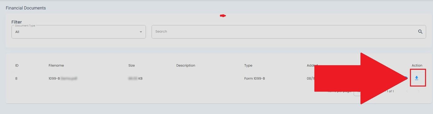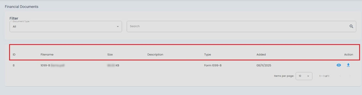 The Table: Financial Documents List table displays your financial documents and tax forms.